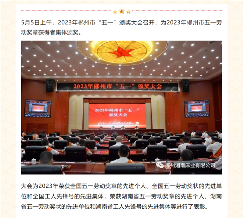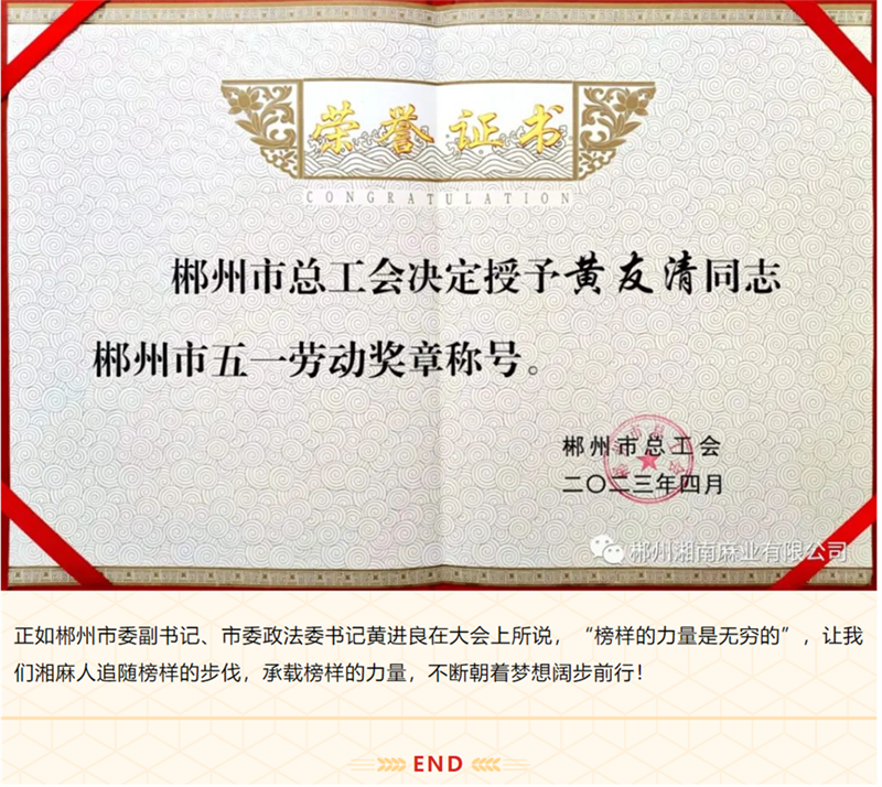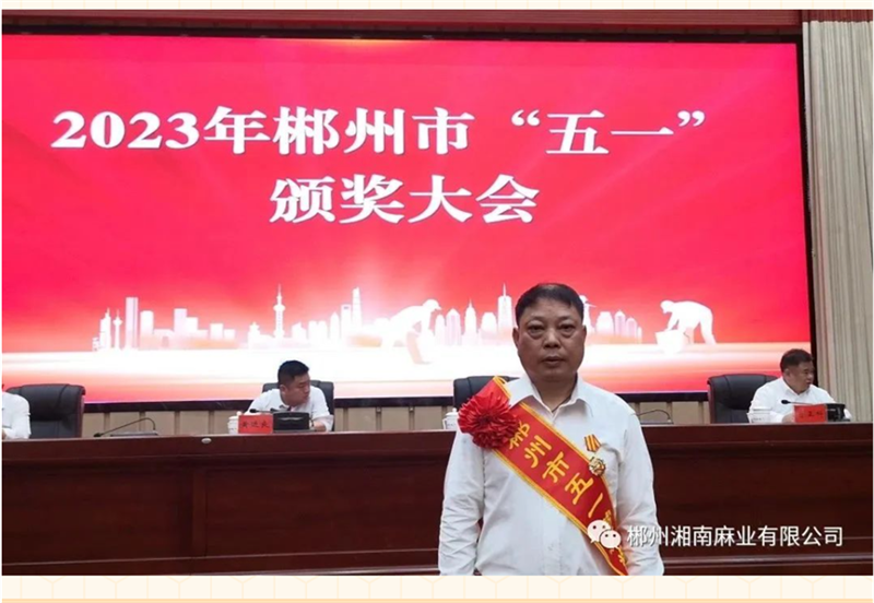 喜報(bào)丨郴州湘南麻業(yè)黃友清同志榮獲“郴州市五一勞動(dòng)獎(jiǎng)?wù)隆惫鈽s稱號(hào)